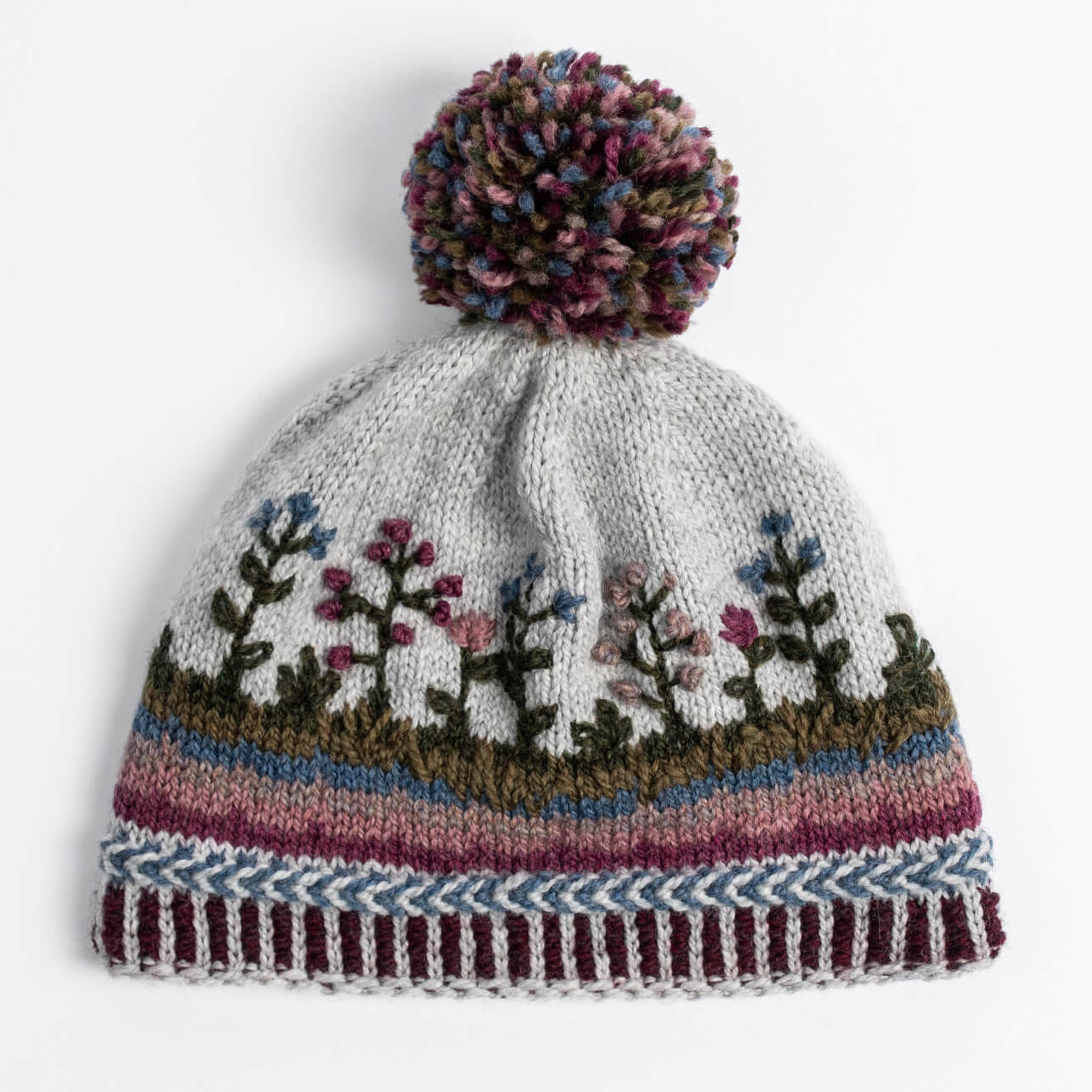 Knit this whimsical, floral design that incorporates colorwork, Latvian Braid and embroidery! Video tutorials included with this free pattern!