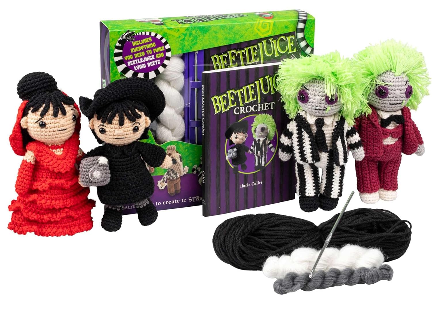 The Ghost with the Most is back in this fun crochet kit that includes all the materials you need to make 2 characters, including Beetlejuice, with glow-in-the-dark hair, and Lydia Deetz in the big floppy hat.