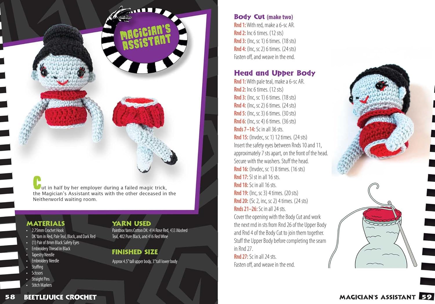 Take a wild and weird trip into the Netherworld Waiting Room for the Recently (and not so recently) Deceased, and crochet 12 projects including Beetlejuice, Lydia Deetz, the creepy stretched faces of Adam and Barbara, the Sandworm, Miss Argentina, Shrunken Head Guy, the two halves of the Magician’s Assistant, and more! Included in this kit are all the materials you need to crochet Beetlejuice in his classic black-and-white striped suit (and with special glow-in-the-dark green yarn for his hair!), as well as Lydia Deetz all in black with her wide-brimmed hat and camera! You’ll find step-by-step instructions for 12 projects sure to delight every Beetlejuice fan.