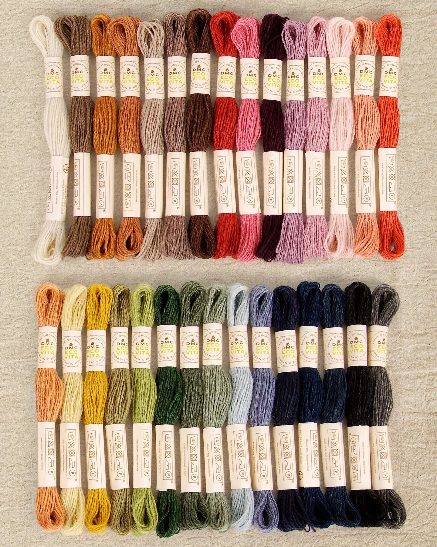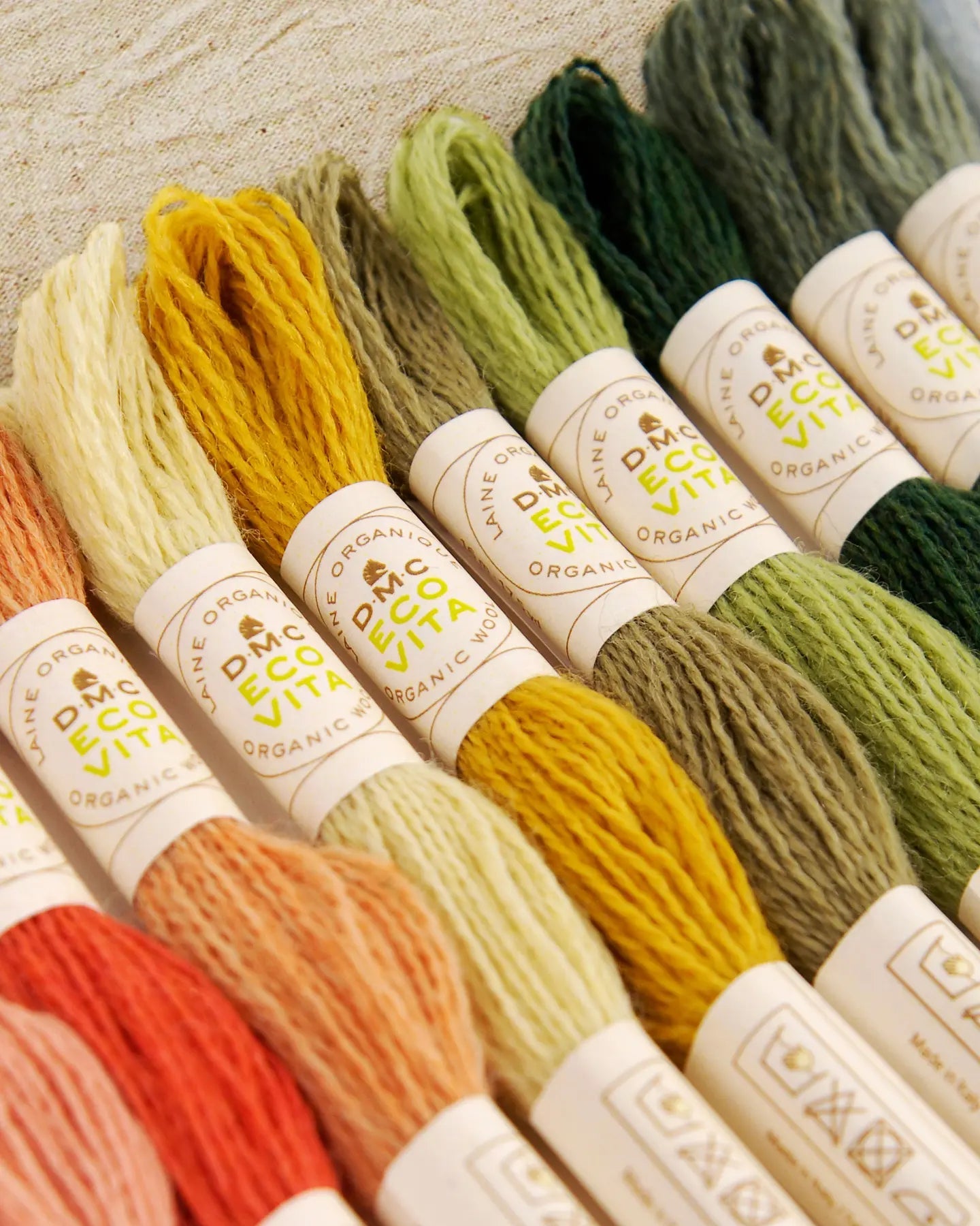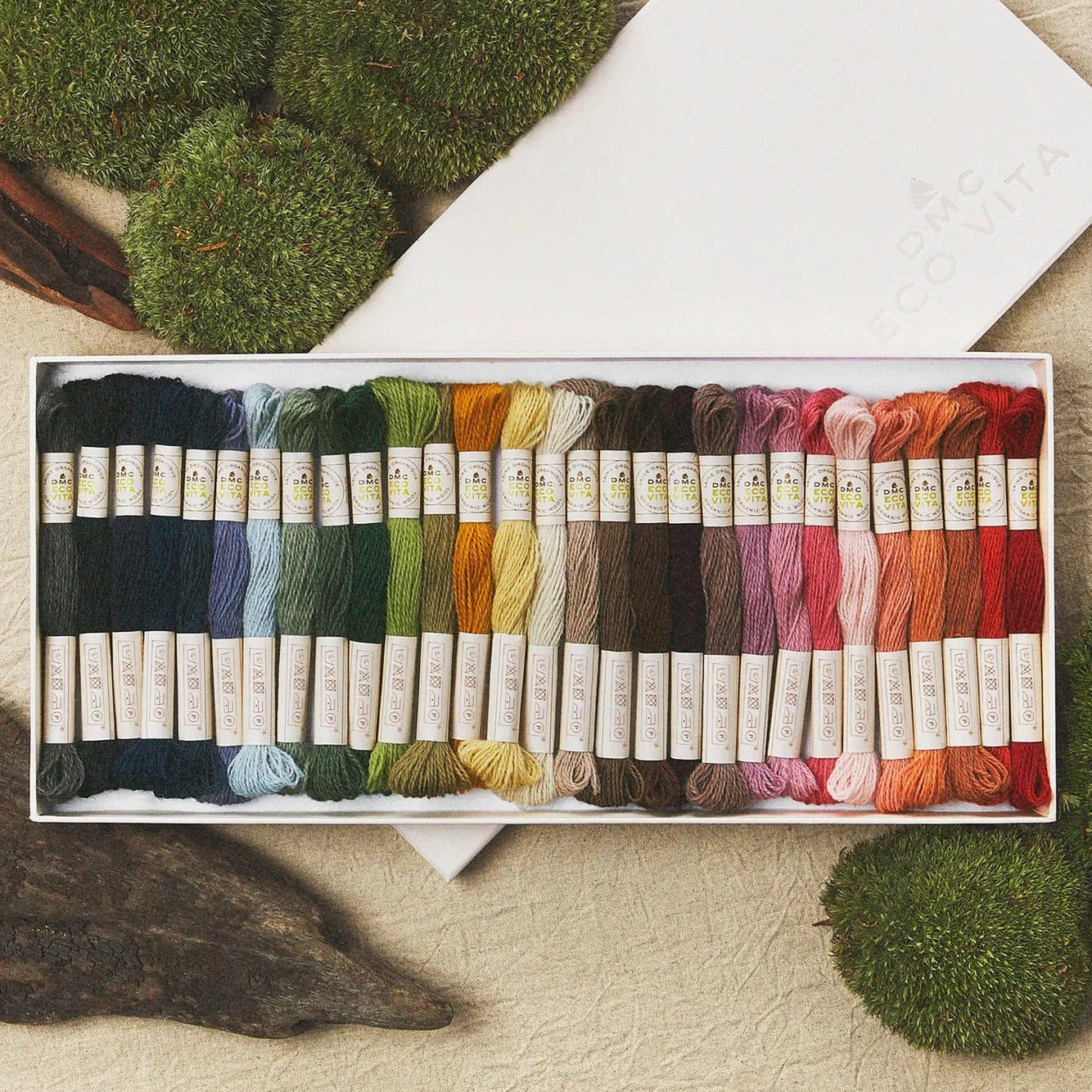 This limited edition box features 30 of the most popular full-sized skeins of Eco Vita Organic Naturally Dyed Organic Wool Thread. There are two free embroidery patterns included to inspire you to start stitching with this extraordinary, sustainable thread. Plus, you'll receive six free patterns by email to inspire your stitching!