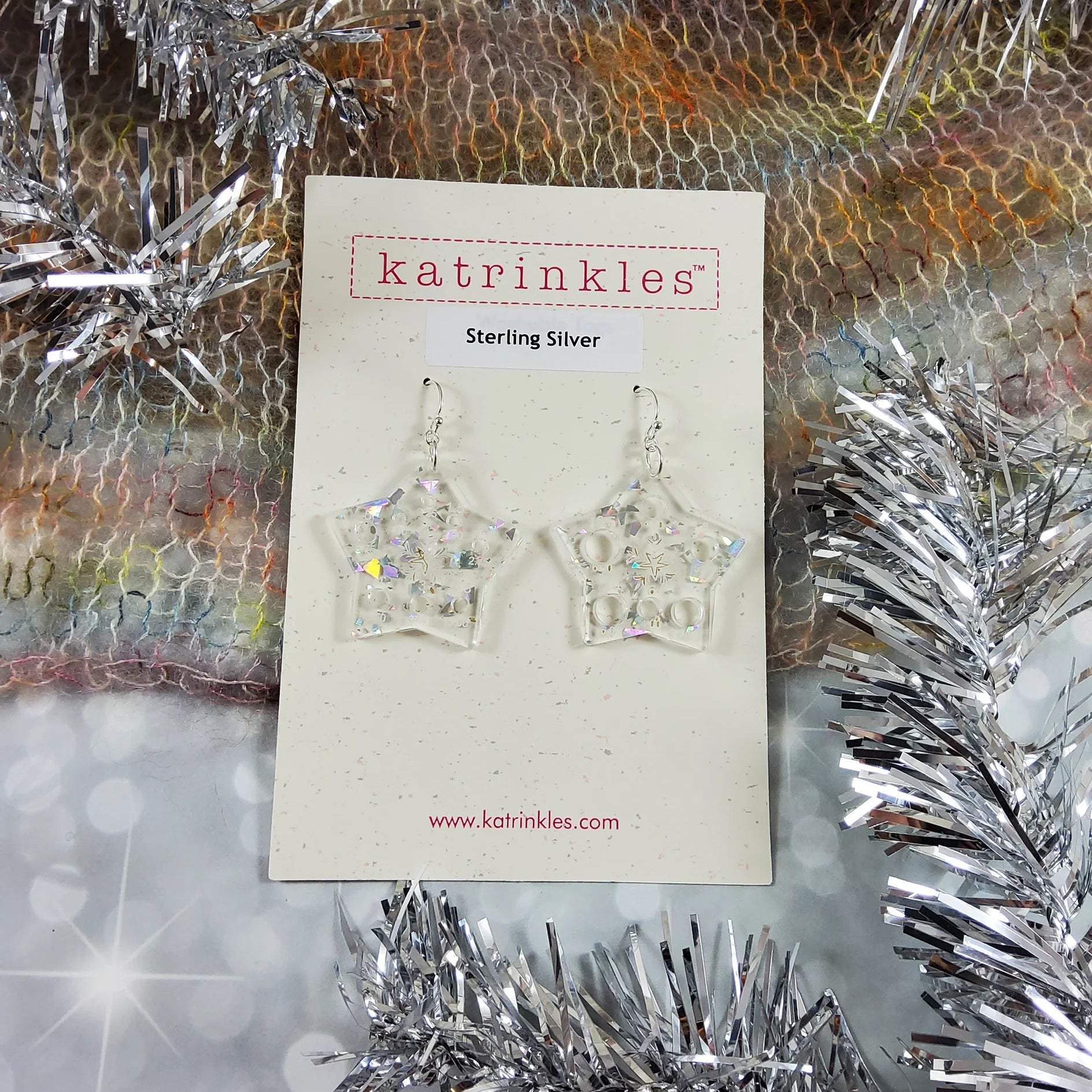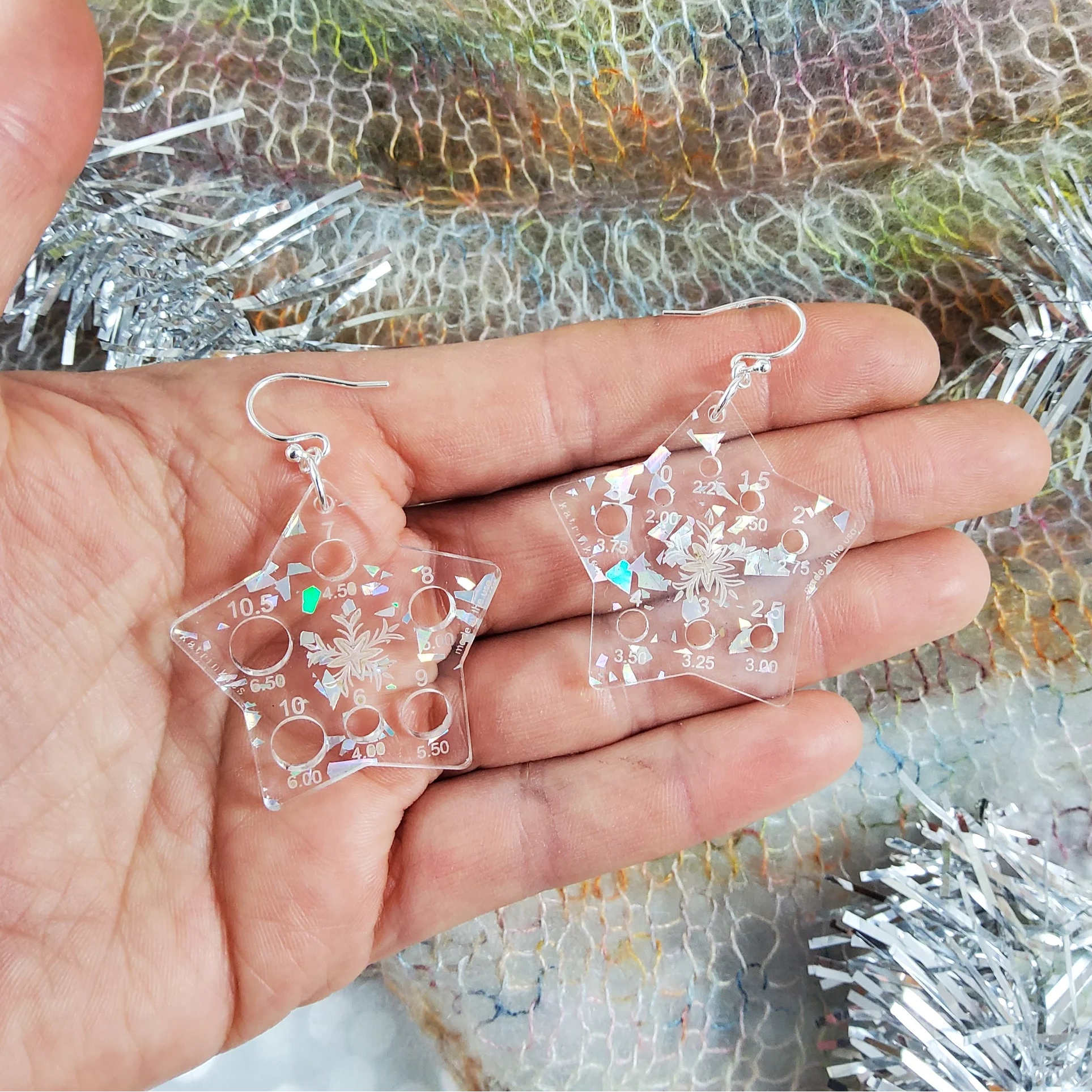 Capture the charm of the winter with these captivating star earrings. Bright colored metallic confetti suspended in crystal clear acrylic adds sparkle and shine to these gleaming star earrings, guaranteed to turn heads at holiday gatherings. Cut to include a set of fully functioning needle gauges, they're sure to earn compliments at knitting meetups too. These functional earrings are the perfect gift for any bright knitter.