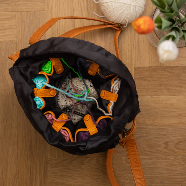 The design allows you to bring your knitting wherever life takes you. Whether you are at home, commuting, or meeting friends, Ingrid keeps your yarn and project protected, accessible, and elegantly contained. Simply fold down the sides of the bag to prop it open. It's a practical storage solution for your crafting supplies such as yarns and needles.