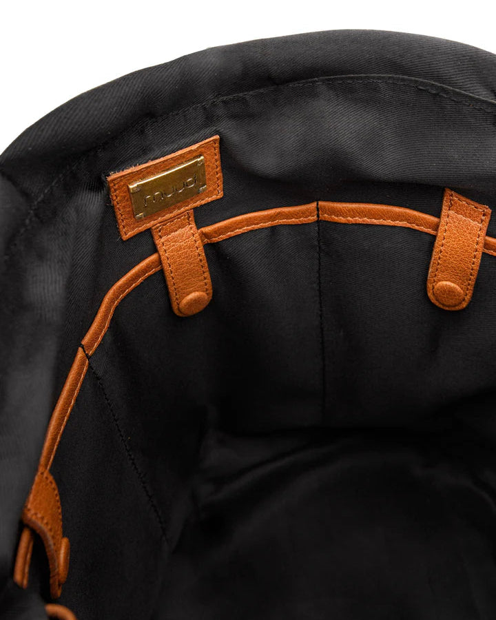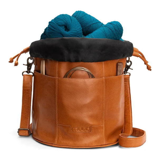 The smooth black fabric lining protects delicate yarn and is easy to clean, too. The bag is finished with a drawstring closure and comes with a detachable shoulder strap that can be adjusted to fit your needs. Available in Saddle Tan and Black Leather.