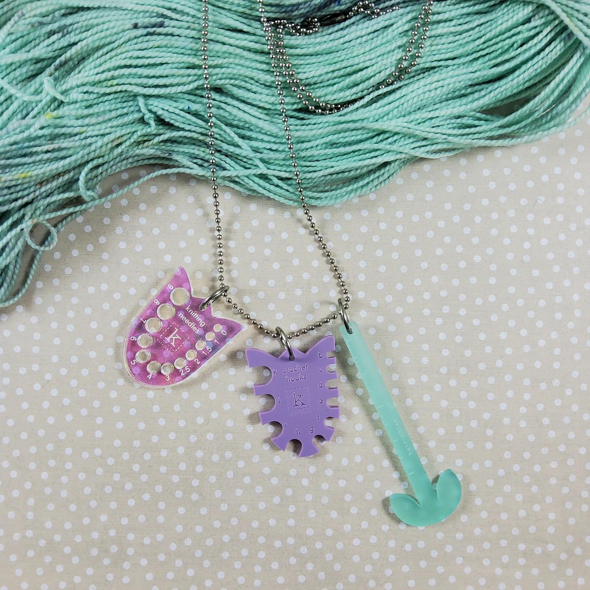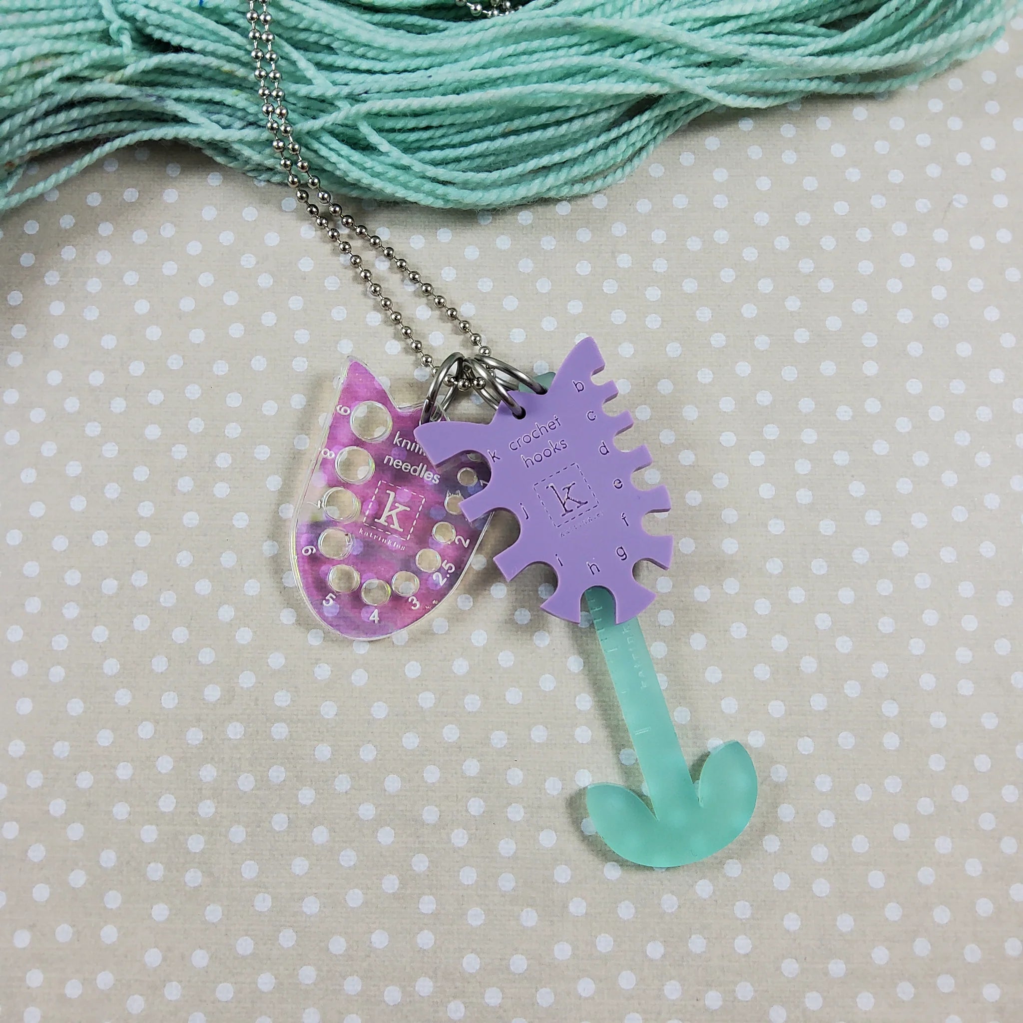This exquisite tulip pendant is a functional knitting and crochet tool, but who would ever know? The knitting needle gauge is cleverly disguised as the tulip flower with a crochet gauge hiding behind in the next layer. Lastly, the stylized stem is actually a 2" ruler! This fun layered piece is held on a 36" ball chain, so use it as a necklace or shorten the chain to attach to your knitting bag or keychain so that you are always ready to craft on the go.