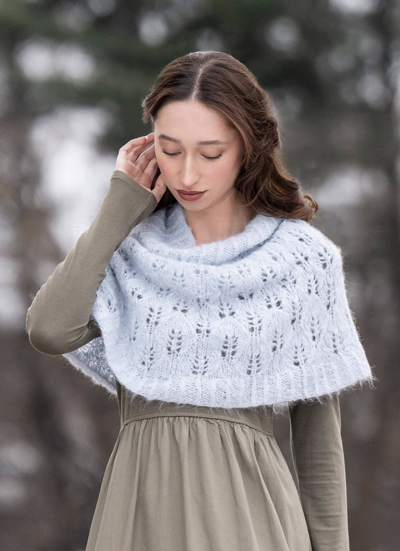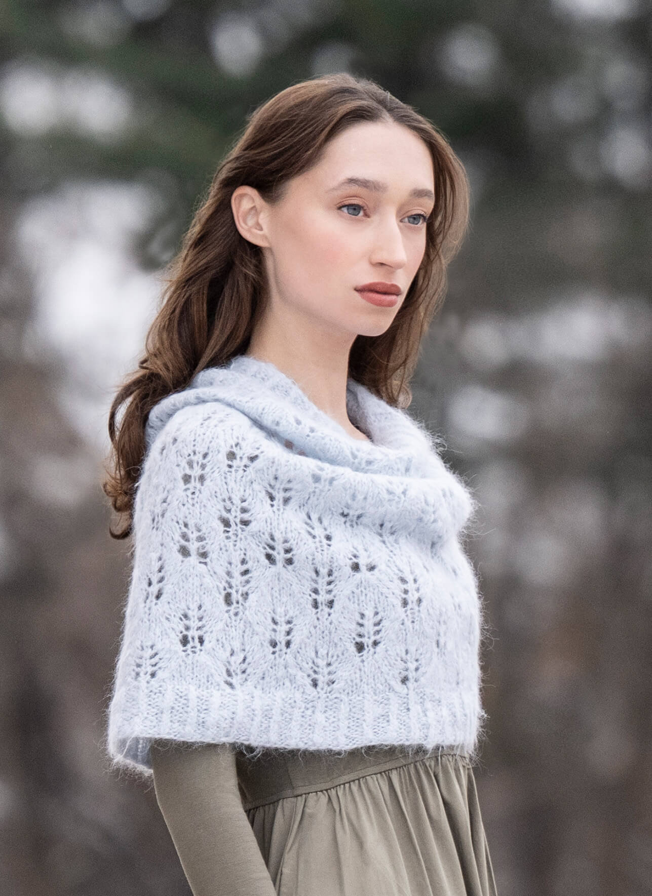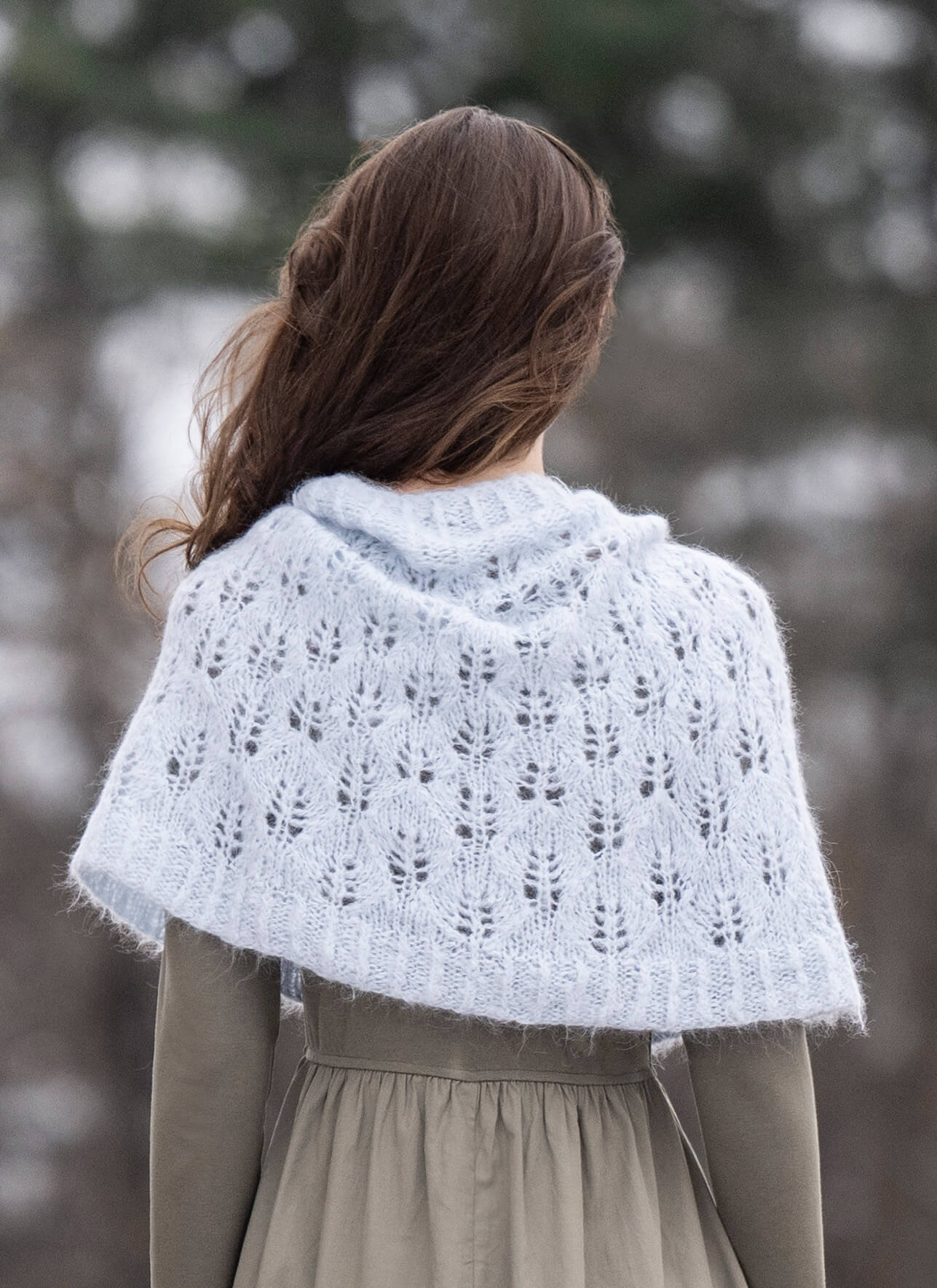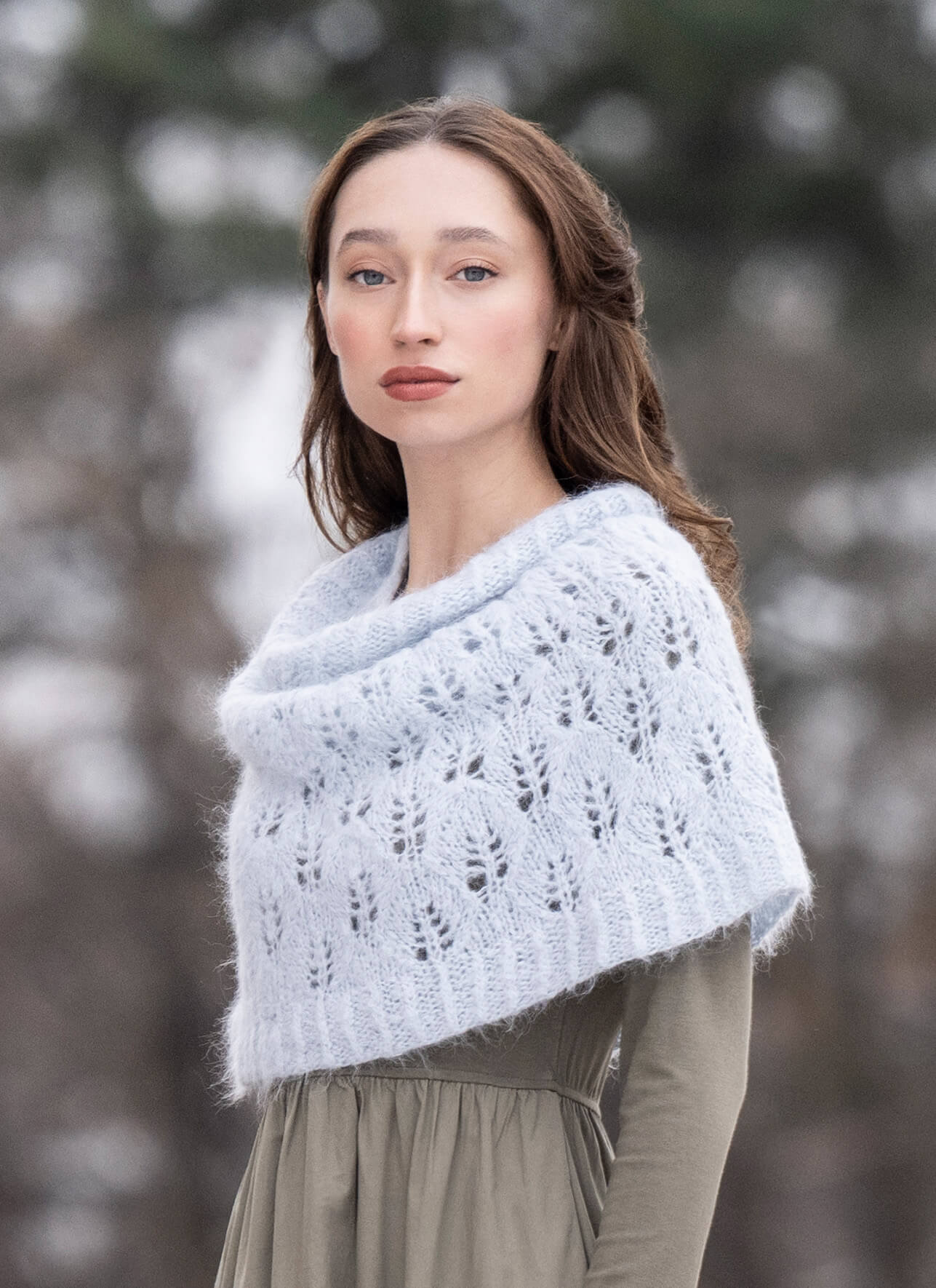 A delicate lace pattern worked with the rich halo of Brushed Suri makes a lighter-than-air accessory which still keeps your shoulders cozy.