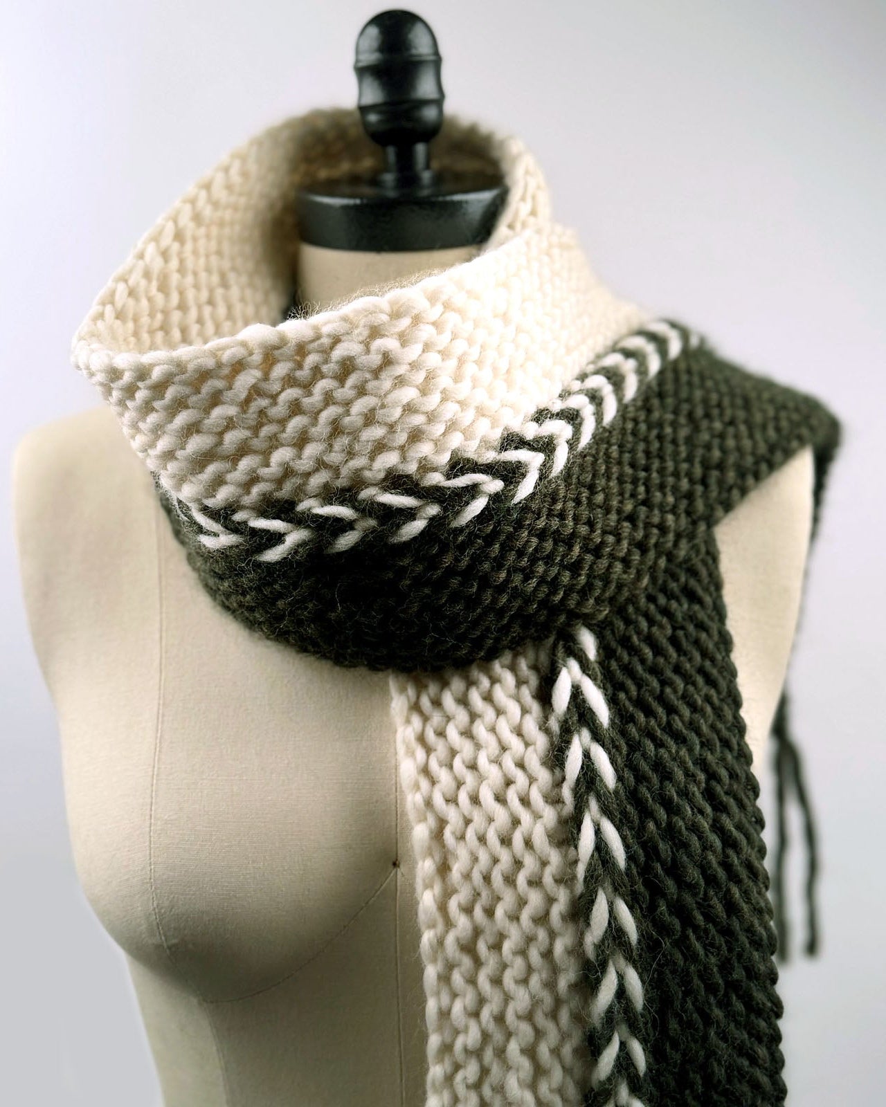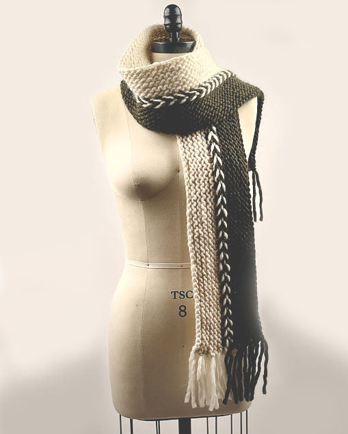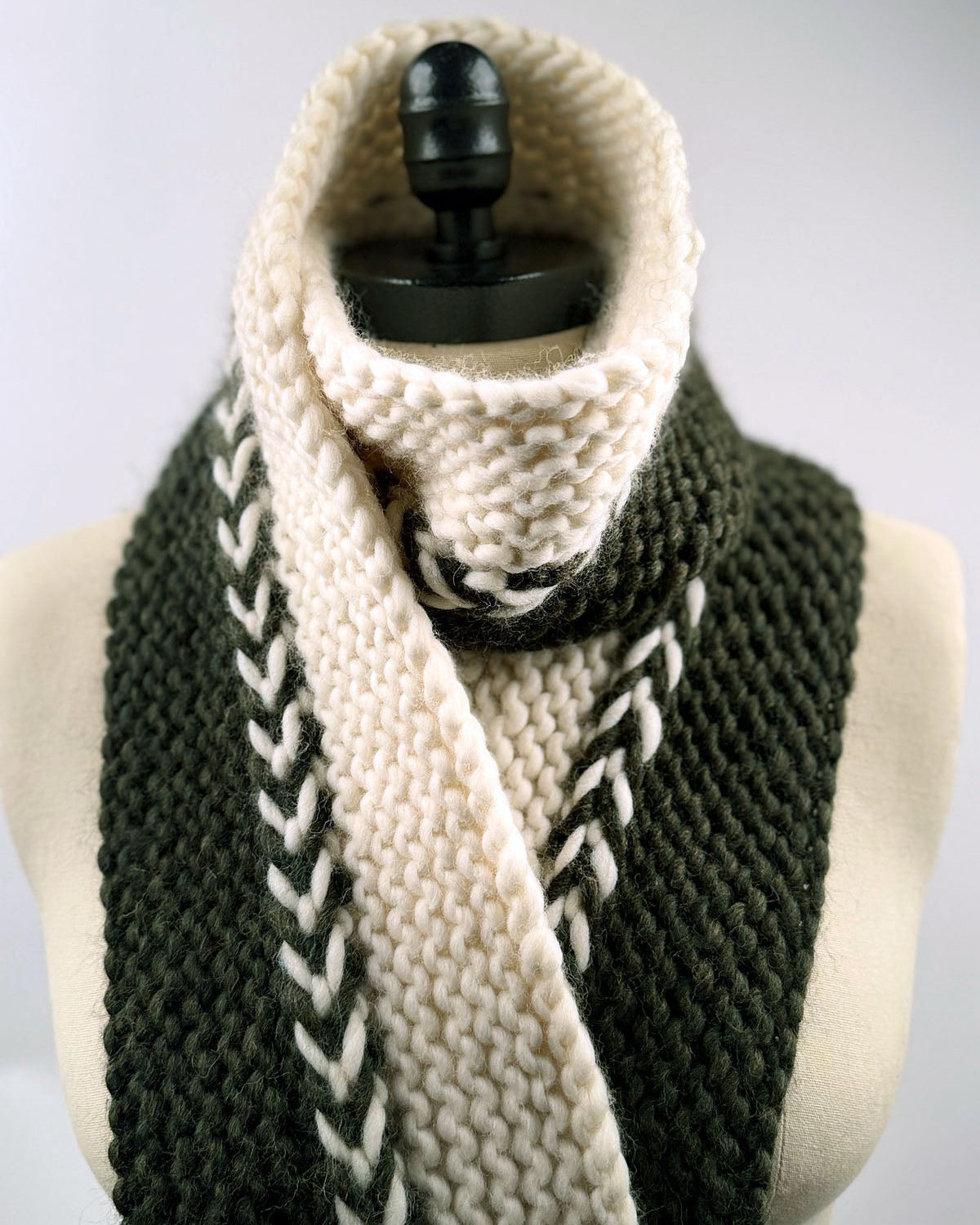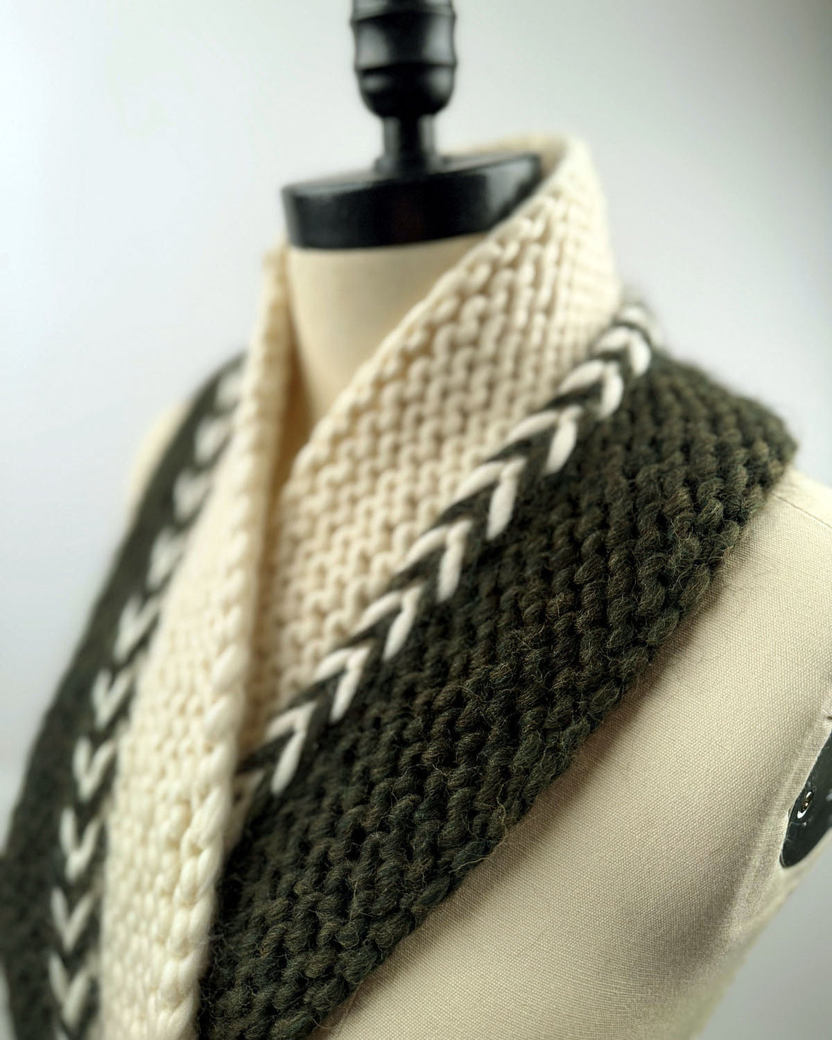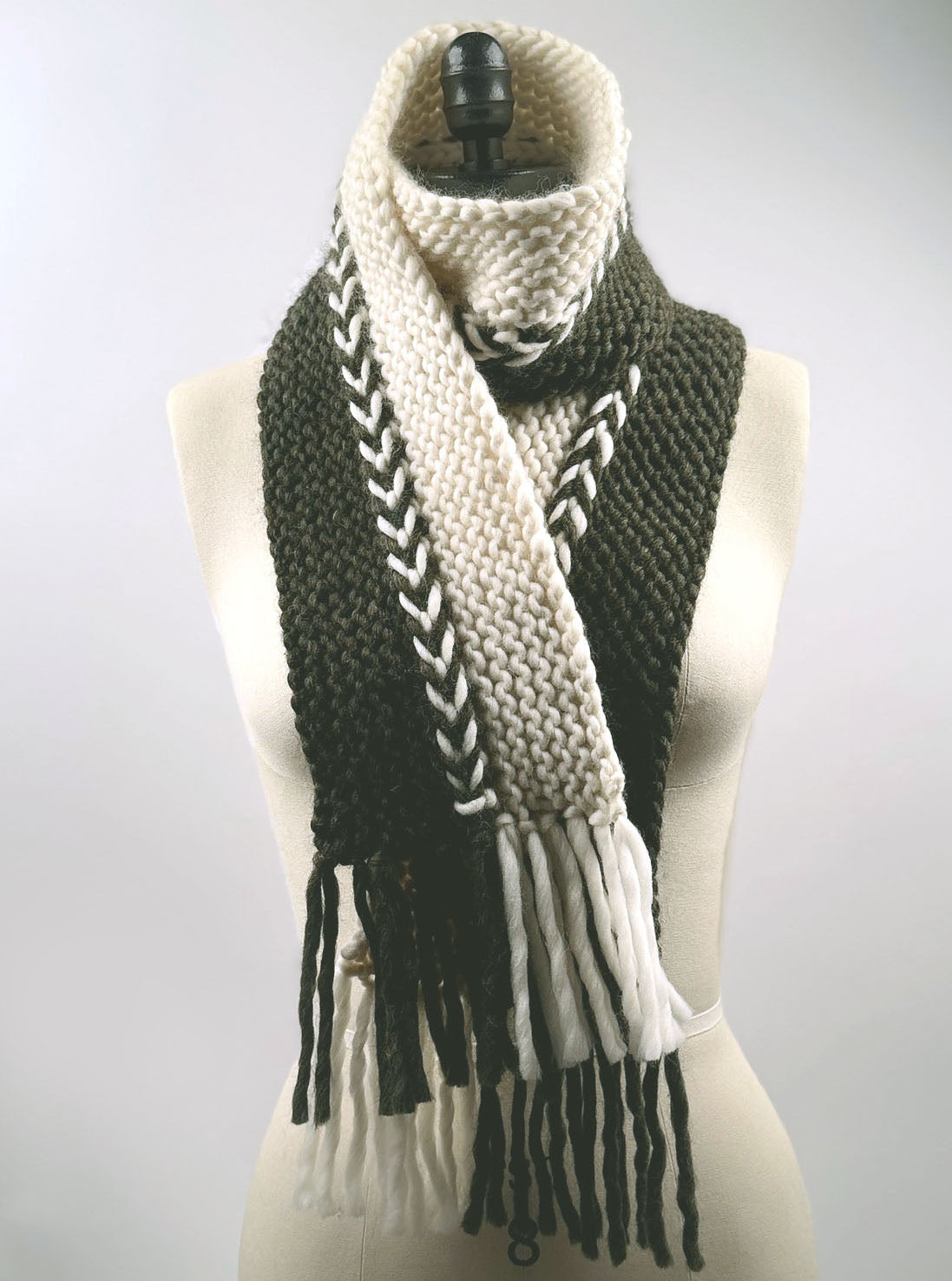 Cozy and quick to knit, the St Clair Scarf is the perfect gift project when time is short. Two contrasting colors meet with a Latvian braid in the middle to make the transition. It’s surprisingly simple and definitely eye-catching, especially after adding the fringe edging.