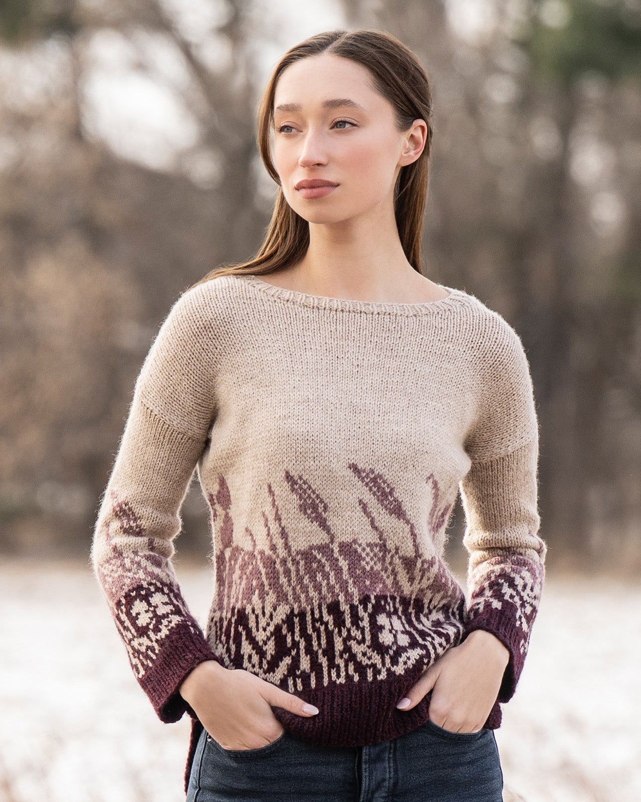 This relaxed drop shoulder sweater is sure to bring a sense of serenity into your life.  The gentle movement of grasses and flowers is evoked in this tri-color sweater made of fine Woolstok yarn from Blue Sky Fibers.