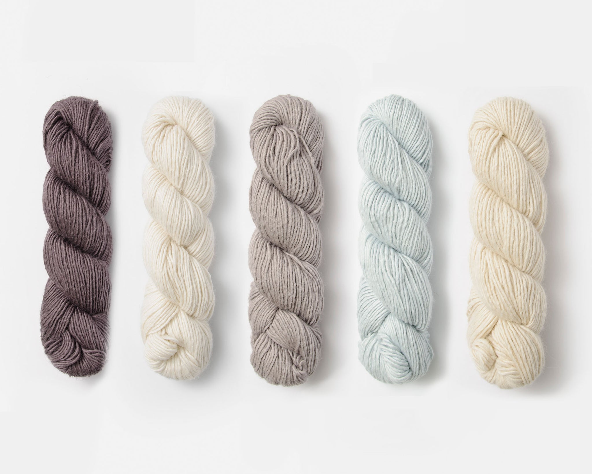 DESIGNER RECOMMENDED YARN: Suri Merino by Blue Sky Fibers (60% Baby Suri Alpaca  / 40% Merino Wool; 100g/164 yds): 4 (4, 4, 5, 6) (6, 7, 7, 8) Skeins Color A, 2 (2, 2, 2, 3) (3, 3, 3, 3) Skeins Color B, 2 (2, 2, 2, 3) (3, 3, 3, 4) Skeins Color C, 3 (4, 4, 4, 5) (5, 6, 7, 7) Skeins Color D, & 2 (2, 2, 2, 2) (3, 3, 3, 3) Skeins Color E.  Shown in color Dusk, Ice Cap, Fog, Cloud & Snow.  PRE-ORDER available in any color.  Please allow at least 7 business days for your pre-order to arrive at your location.