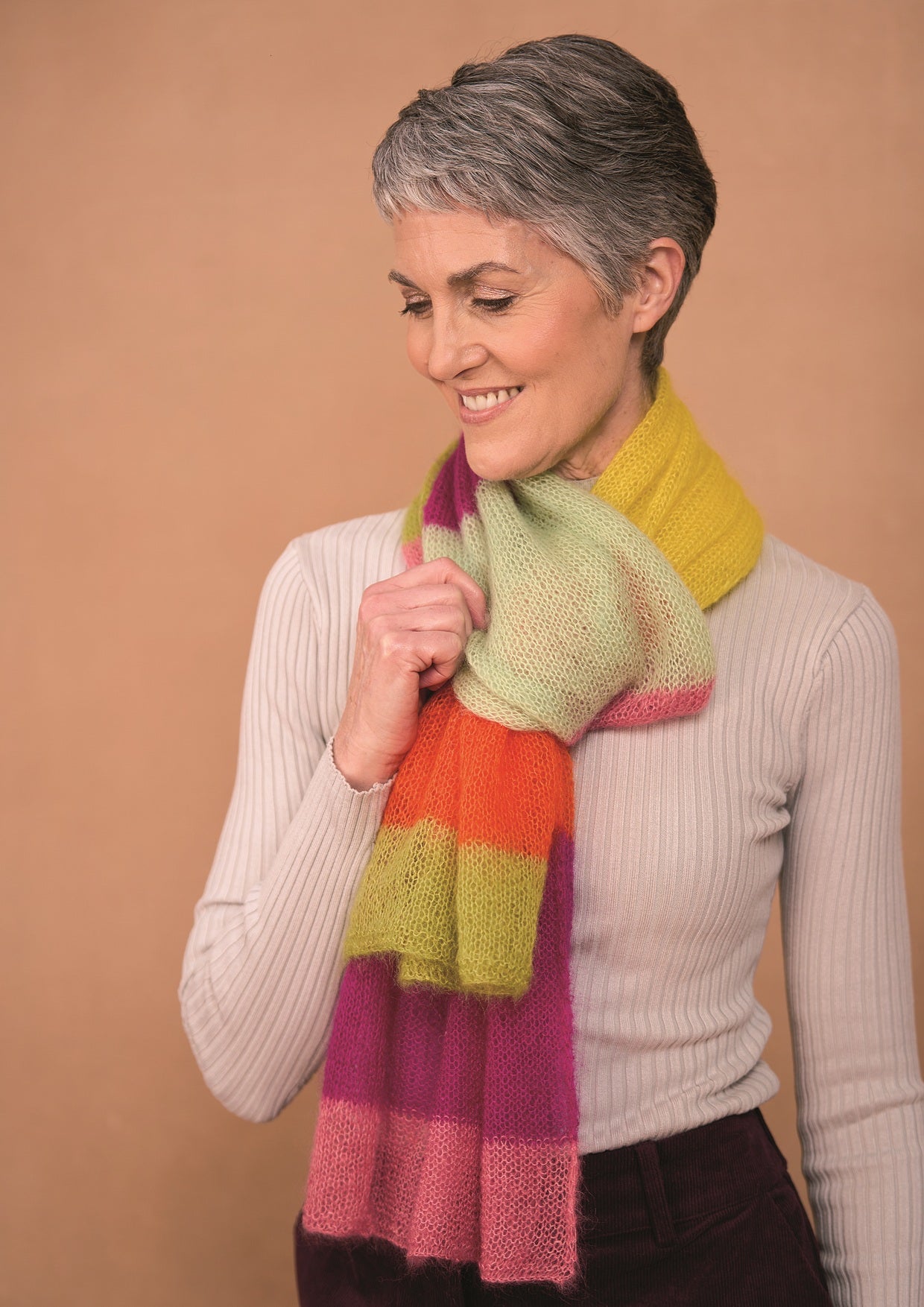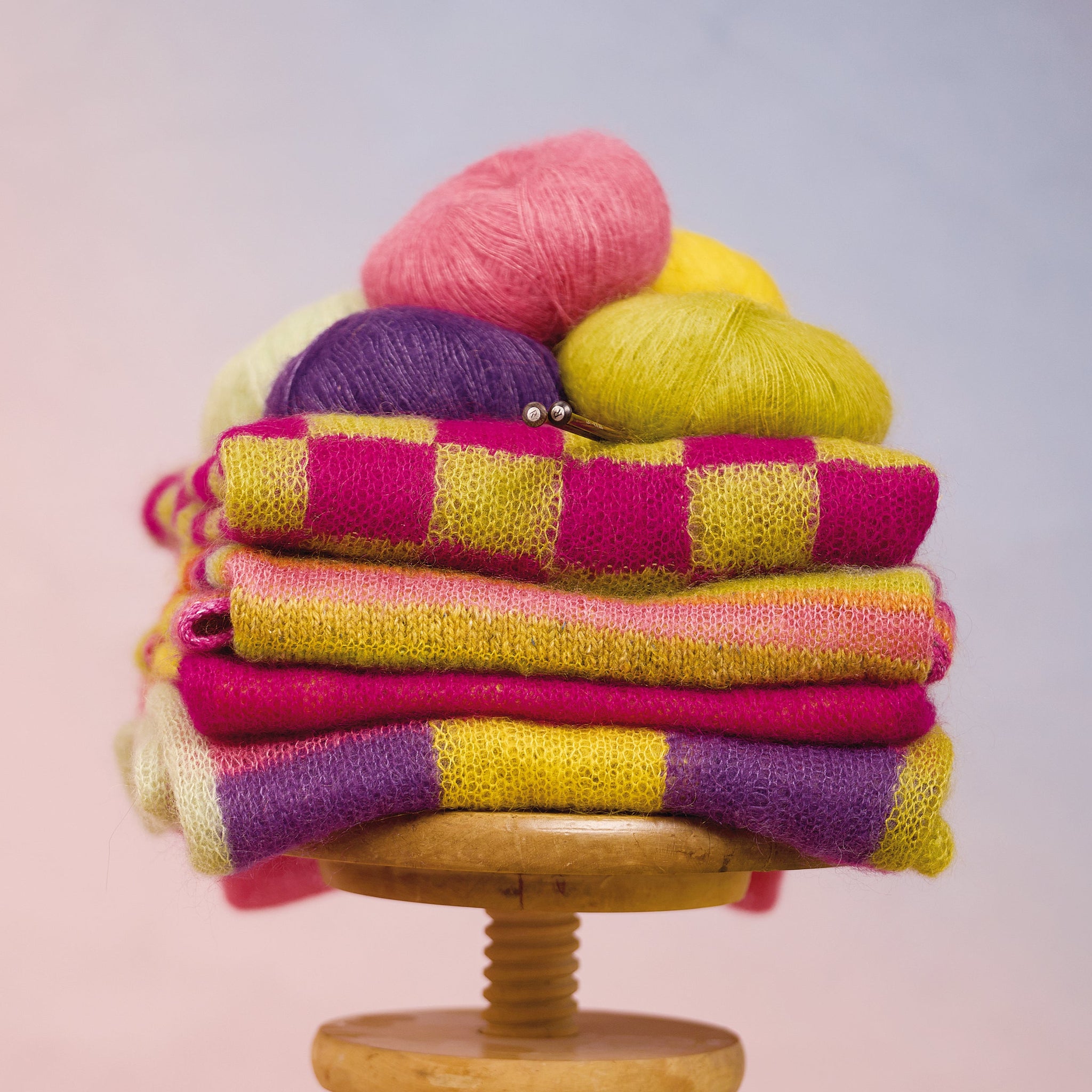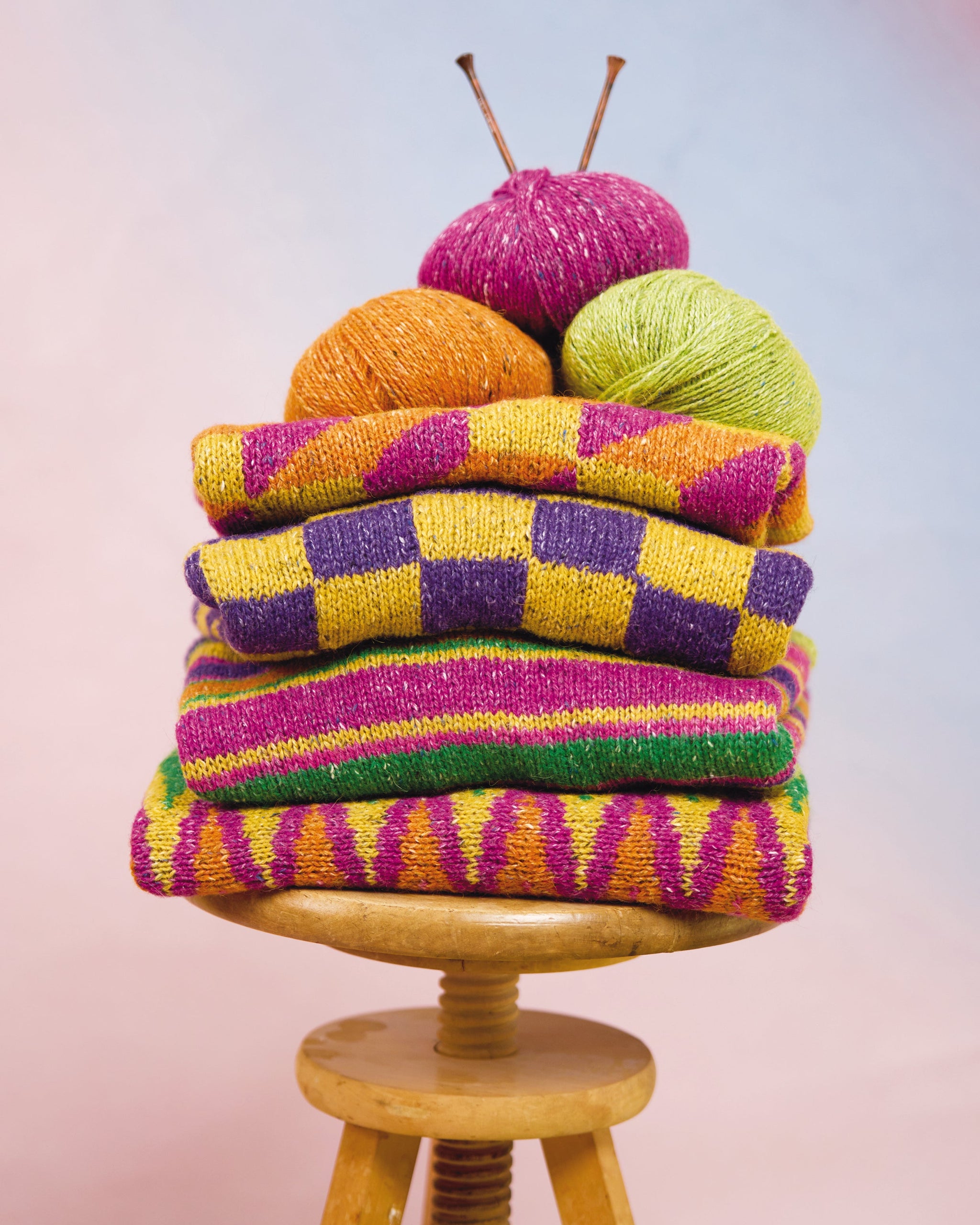 In a vibrant and rich curated palette by renowned designer Kaffe Fassett, this collection of eight designs showcases new shades of Felted Tweed and Kidsilk Haze in Kaffe’s signature style.  With simple shapes and accessories, these pieces let the striking geometric patterns and vibrant color combinations take center stage, celebrating colorwork knitting.
