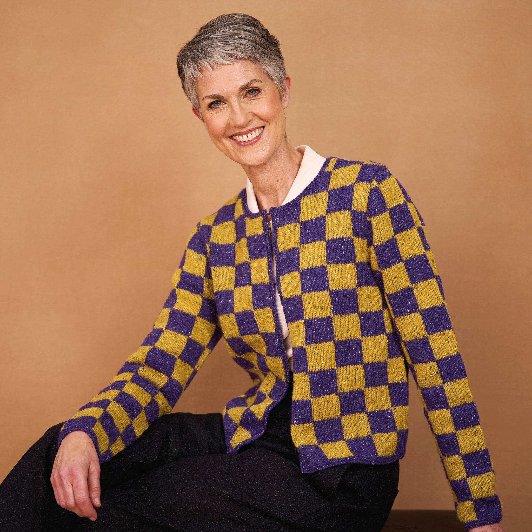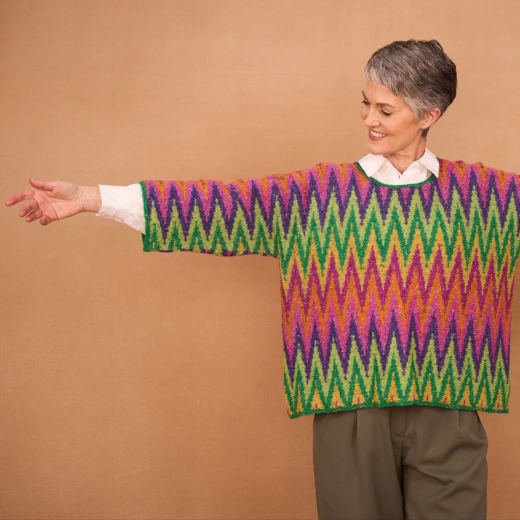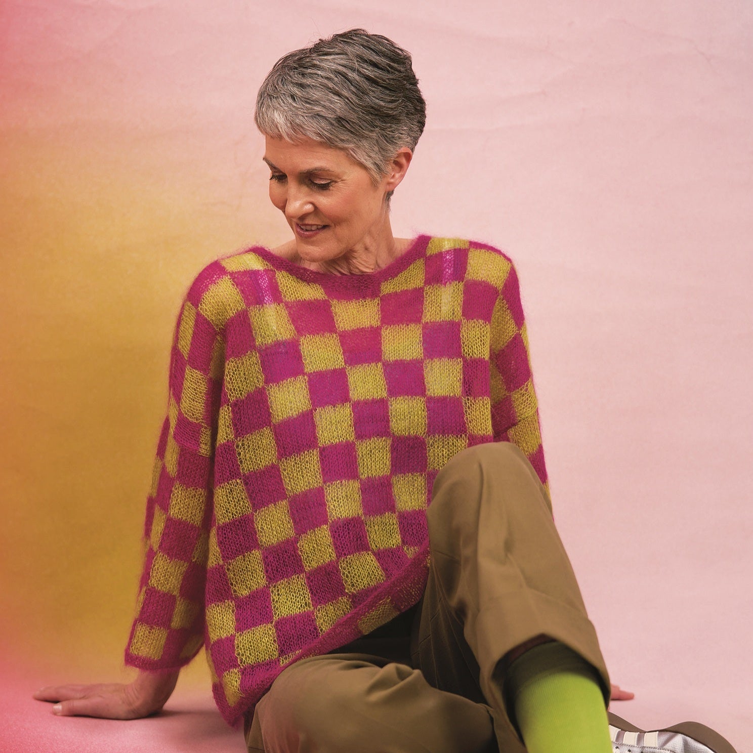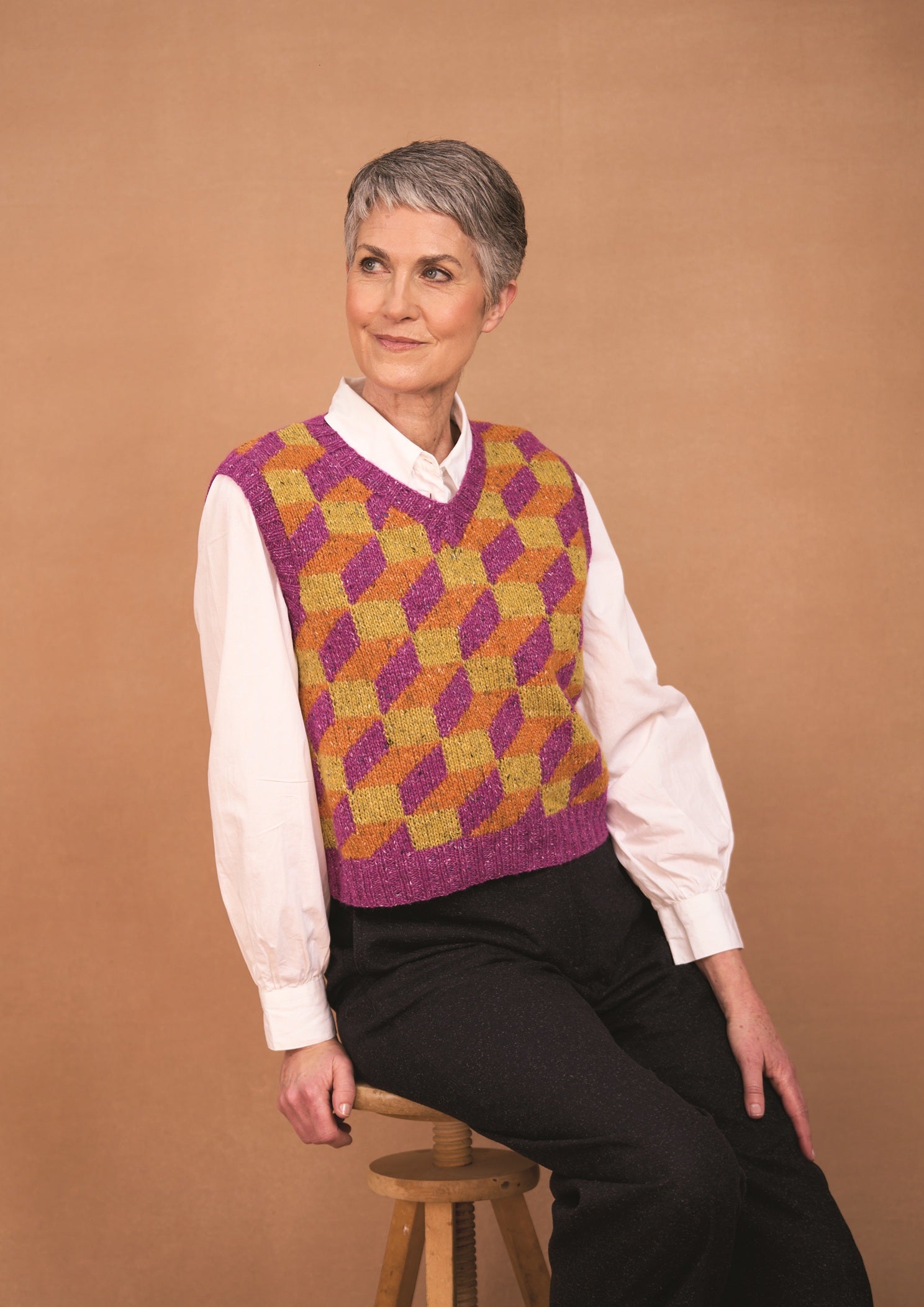 In a vibrant and rich curated palette by renowned designer Kaffe Fassett, this collection of eight designs showcases new shades of Felted Tweed and Kidsilk Haze in Kaffe’s signature style.  With simple shapes and accessories, these pieces let the striking geometric patterns and vibrant color combinations take center stage, celebrating colorwork knitting.