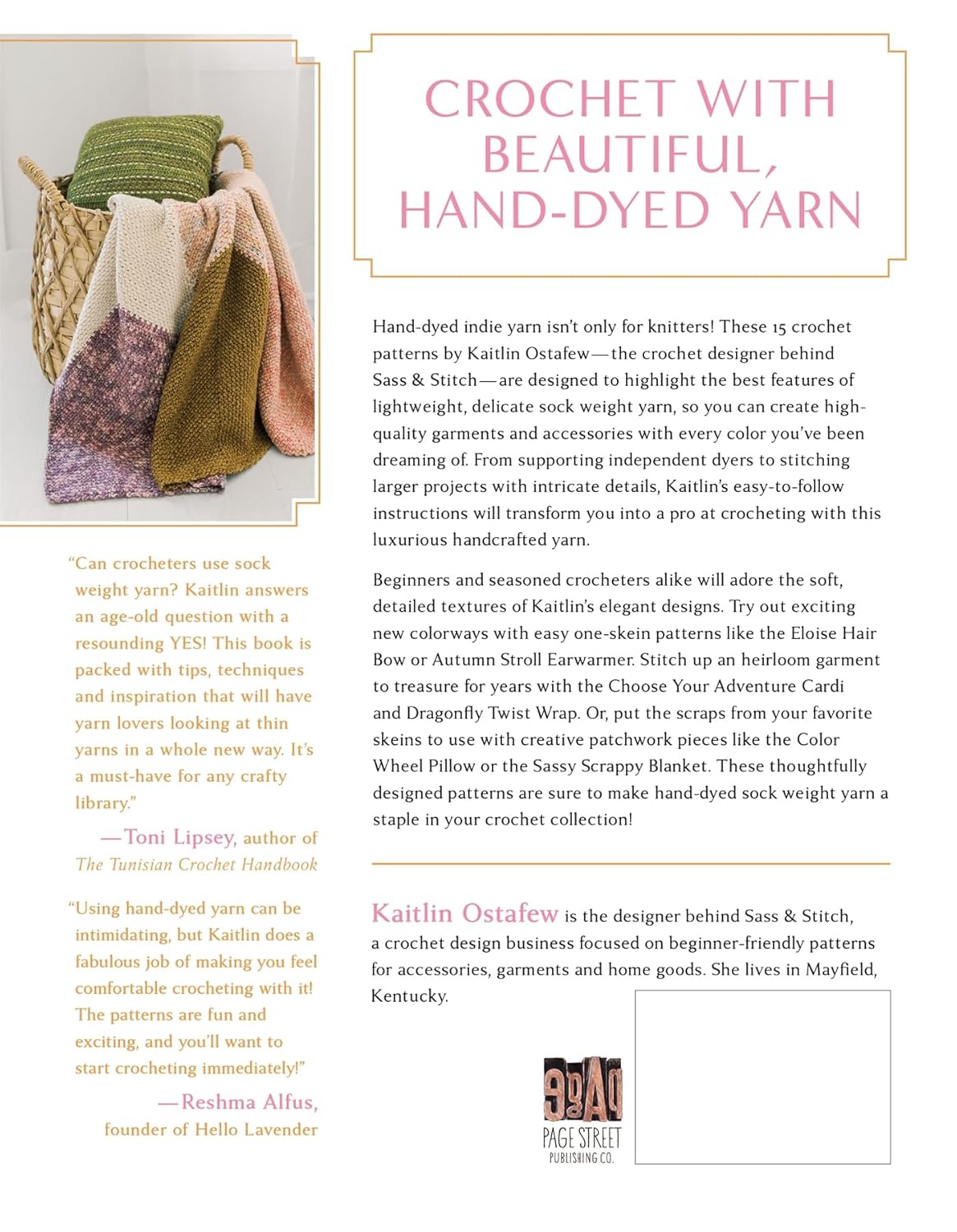 Hand-dyed indie yarn isn’t only for knitters! These 15 crochet patterns by Kaitlin Ostafew―the crochet designer behind Sass & Stitch―are designed to highlight the best features of lightweight, delicate sock weight yarn, so you can create high-quality garments and accessories with every color you’ve been craving. From supporting independent dyers to stitching larger projects with intricate details, Kaitlin’s easy-to-follow instructions will transform you into a crochet pro using luxurious hand-dyed yarn.